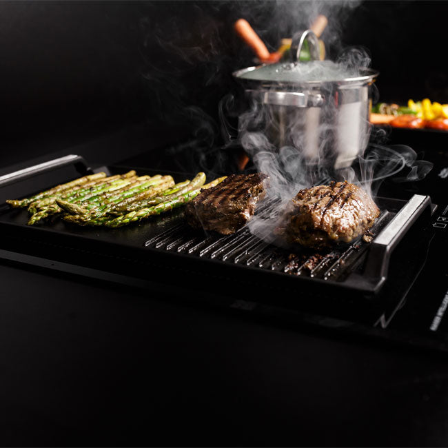One rigid and one flat. The rigid side allows you to create a seared finish for your food. Producing markings identical to the mouth-watering finish you get when BBQing, while also conveniently letting excess fat run away into the griddles channels.