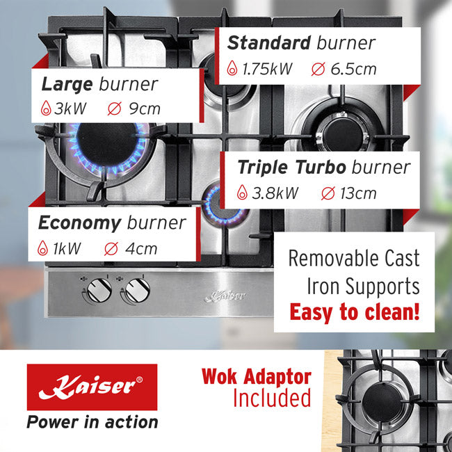 The Grand Chef KG 6364 Turbo gas hob is designed for practicality, flexibility, and performance. Its optimised burner layout provides more usable cooking space than standard 2×2 arrangements, making it easier to cook with multiple pots and pans at once. The triple Turbo burner delivers intense heat, ideal for stir-frying or searing, while the additional burners handle everything from simmering to boiling.