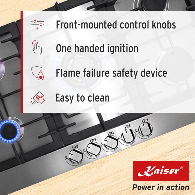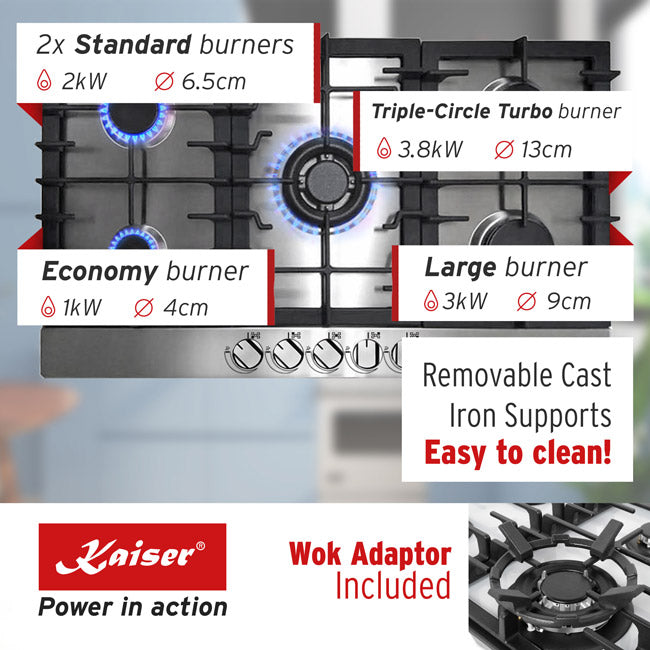 The front-mounted metal knobs make operation safe and easy, while the flame failure safety device ensures peace of mind. With cast iron pan supports that are sturdy, durable, and dishwasher-safe, plus a removable wok adapter, this hob delivers both practicality and professional-grade performance.