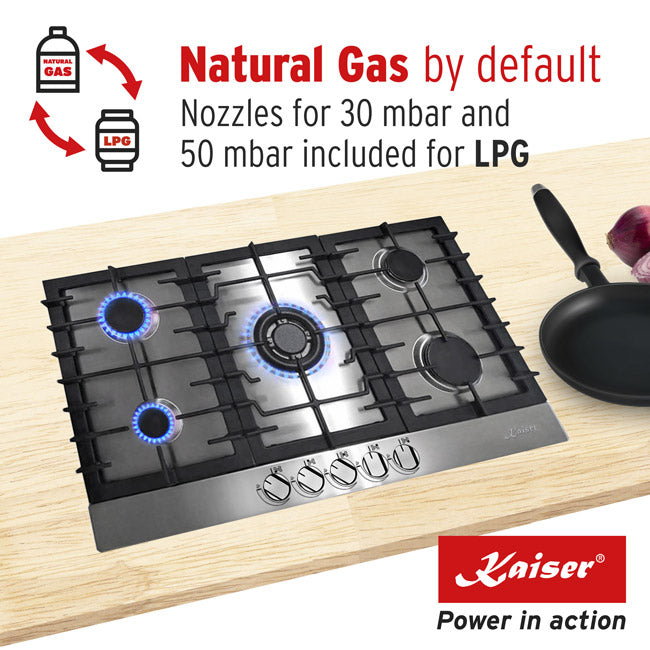 The Grand Chef KG 9356 Turbo hob combines a striking stainless steel surface with the flexibility of five burners, giving you plenty of space for large family cooking or entertaining. At its heart is the triple Turbo burner, perfect for wok cooking or high-intensity searing, supported by a large burner, two standards, and a smaller economy burner for low simmering. Preset for mains gas but supplied with LPG/propane nozzles, it offers straightforward installation options.