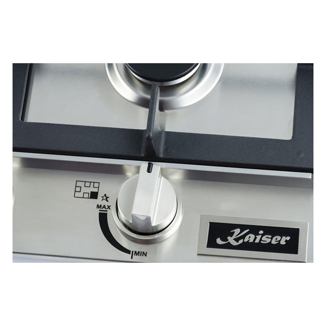 The Kaiser Avantgarde Pro KG 9357 Turbo. A very crisp, clean and modern style of hob, with gas-powered burners on a reflective high-grade steel cooktop. The perfect choice for modern kitchens to match stainless steel or silver appliances.