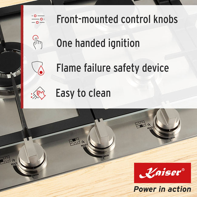 All Kaiser gas appliances are equipped with our automatic pilotless ignition. Simply turn the metal knobs to ignite any of the reliable burners. And, of course, our control knobs are front-mounted so you don't need to reach over any naked flames. Your safety is always of paramount importance. This is why we also have our flame failure safety device, which will cut off the gas supply automatically in the event the flame is unexpectedly extinguished.