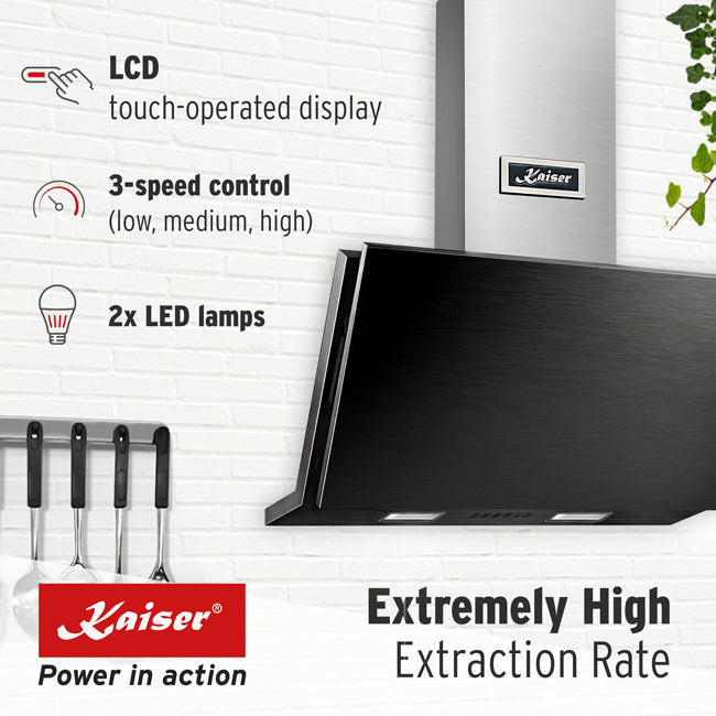 Electronic touch controls and Kaiser’s Intelligent System make operation simple, offering timer-based extraction and automatic reset after boost mode. Edge suction and carbon filters provide excellent odour control whether ducted or recirculating. Two efficient LED lights keep your cooking area well illuminated, making this hood the perfect modern partner to the Avantgarde Pro range cooker.