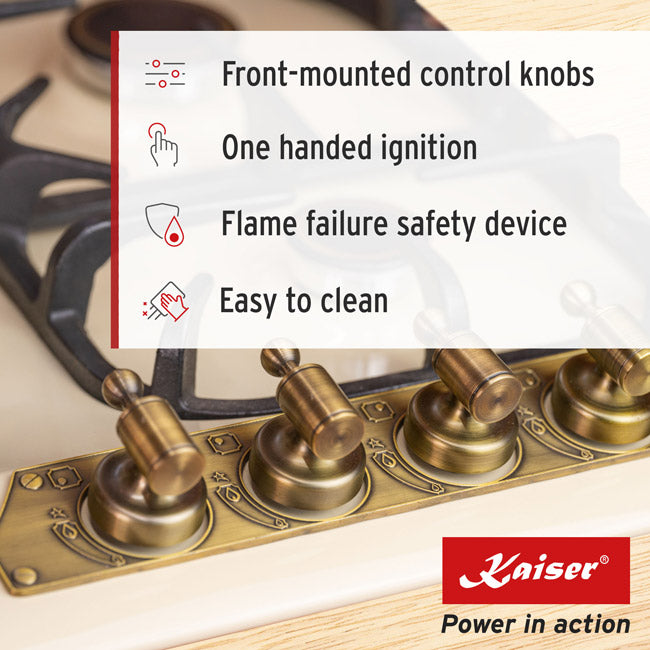 All Kaiser gas appliances are equipped with our automatic pilotless ignition. Simply turn the elegant bronze metal knobs to ignite any of the reliable burners. And, of course, our control knobs are front-mounted so you don't need to reach over any naked flames. Your safety is always of paramount importance. This is why we also have our flame failure safety device, which will cut off the gas supply automatically in the event the flame is unexpectedly extinguished.