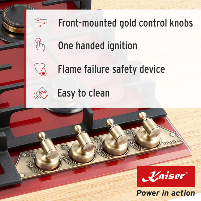 All Kaiser gas appliances are equipped with our automatic pilotless ignition. Simply turn the elegant gold knobs to ignite any of the reliable burners. And, of course, our control knobs are front-mounted so you don't need to reach over any naked flames. Your safety is always of paramount importance. This is why we also have our flame failure safety device, which will cut off the gas supply automatically in the event the flame is unexpectedly extinguished.