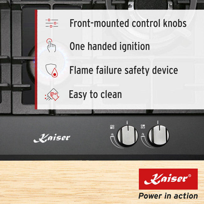 All Kaiser gas appliances are equipped with our automatic pilotless ignition. Simply turn the sturdy metal knobs to ignite any of the reliable burners. And, of course, our control knobs are front-mounted so you don't need to reach over any naked flames. Your safety is always of paramount importance. This is why we also have our flame failure safety device, which will cut off the gas supply automatically in the event the flame is unexpectedly extinguished.