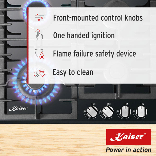 All Kaiser gas appliances are equipped with our automatic pilotless ignition. Simply turn the sturdy metal knobs to ignite any of the reliable burners. And, of course, our control knobs are front-mounted so you don't need to reach over any naked flames. Your safety is always of paramount importance. This is why we also have our flame failure safety device, which will cut off the gas supply automatically in the event the flame is unexpectedly extinguished.